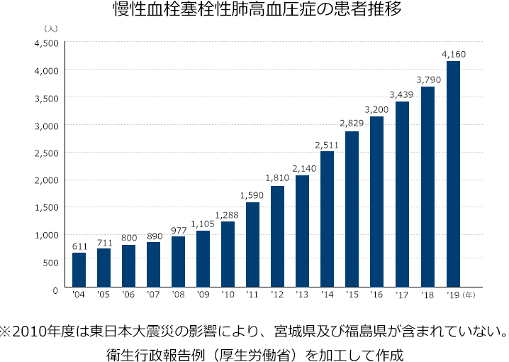 ・慢性血栓塞栓性肺高血圧症(CTEPH)の患者さんはどれくらいいるの?2018年度に特定医療費(指定難病)受給者証を交付されている方は3,790人、2019年度では4,160人と報告されています。